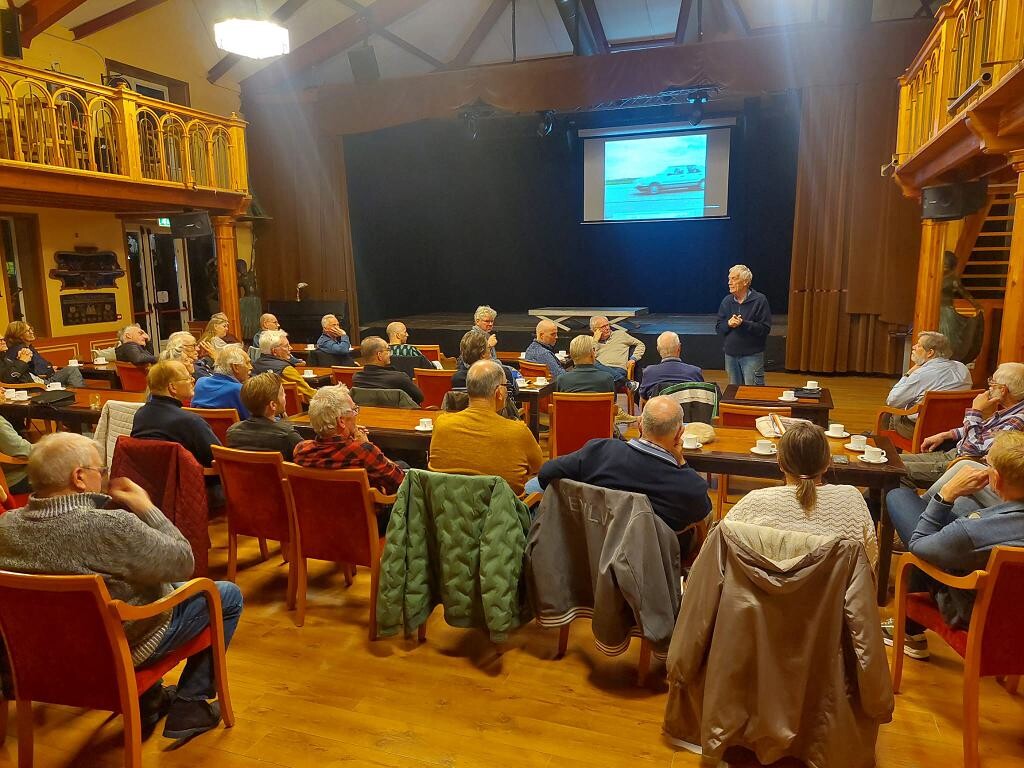 Terug in het hotel was het tijd voor het bekijken van wat mooie Saab video’s, deze werden in de theater zaal getoond. Mart Leek, mede eigenaar van het hotel, was gestrikt om ons het een over zijn belevenissen en over het hotel te vertellen. Dit was een boeiend verhaal waarbij zowel zijn studie Pharmacie, het maken van klompen, het rijden in klassieke bussen,het bouwen aan het hotel als ook de geschiedenis van een aantal opbjecten uit de doeken gedaan werden. De fraaie Franse (straat) gasverlichting verdienen hier een aparte vermelding.
