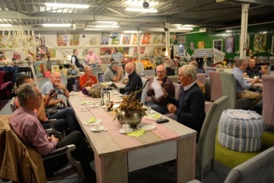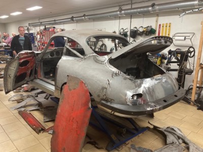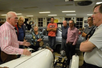 Deze eerste ‘post-Corona’ bijeenkomst stond in het teken van elkaar ontmoeten en bijpraten. Na een welkomst woord van Robert van der Linden trapten we de avond af met koffie en appeltaart aangeboden door Dirk en Cora Kuiper. Onze gastheer Dirk Kuiper verzorgde vervolgens een rondleiding door zijn Gallery of Dreams en praatte ons langs verschillende merken en modellen. De passie voor automobielhistorie spatte ervan af. En ook in de werkplaats van Dirk werden wij uitvoerig meegenomen in het vak, de ambacht van plaatwerker. En vak waar Dirk niet alleen al ruim 50 jaar ervaring heeft, maar waarin hij ook cursussen verzorgt. In de werkplaats stond o.a. een flink verroestte Porsche 356 die grotendeels opnieuw wordt opgetrokken uit vers staal. Uiteraard volledig met de hand gevormd en geklopt uit platen hoge kwaliteit staal.