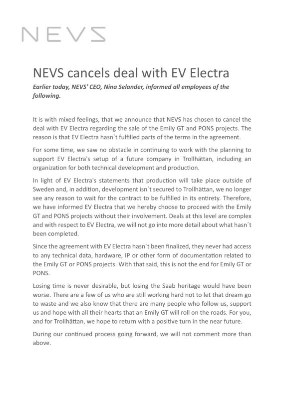 Eerder vandaag informeerde de CEO van NEVS, Nina Selander, alle medewerkers van NEVS hierover. “Met gemengde gevoelens kondigen we aan dat NEVS ervoor heeft gekozen om de deal met EV Electra over de verkoop van de Emily GT- en PONS-projecten te annuleren. De reden hiervoor is dat EV Electra delen van de overeenkomst niet is nagekomen. Wij zagen geruime tijd geen belemmering om verder te werken met de planning en ondersteuning van EV Electra's oprichting van een toekomstig bedrijf in Trollhättan, inclusief een organisatie voor zowel technische ontwikkeling als productie. In het licht van de verklaringen van EV Electra dat de productie buiten Zweden zal plaatsvinden en de verdere ontwikkeling dus niet in Trollhättan blijft, ziet NEVS niet langer een reden om te wachten tot de overeenkomst in zijn geheel is nagekomen. Daarom heeft NEVS EV Electra geïnformeerd dat zij er hierbij voor kiezen om door te gaan met de Emily GT- en PONS-projecten zonder hun betrokkenheid”, aldus Nina Selander. Zij vervolgt: “Deals op dit niveau zijn complex en met betrekking tot EV Electra zullen we niet dieper ingaan op wat niet is nagekomen. Omdat de overeenkomst met EV Electra nog niet rond was, heeft EV Electra nooit toegang gehad tot alle technische gegevens, hardware, IP of andere vorm van documentatie die verband houdt met de Emily GT- of PONS-projecten. Dat gezegd hebbende, dit is niet het einde voor Emily GT of PONS. Tijd verliezen is nooit wenselijk, maar het verliezen van het Saab-erfgoed is helemaal onwenselijk. Er zijn enkelen onder ons die nog steeds hard werken om die droom niet los te laten en we weten ook dat er veel mensen zijn die ons volgen, steunen en hopen met heel hun hart dat er een Emily GT over de weg zal rollen. Voor jou, en voor Trollhättan hopen we in de nabije toekomst met een positieve wending terug te keren. Tijdens ons verdere proces zullen we niet meer commentaar geven dan hierboven.”