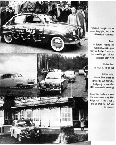 In februari 1960 schenkt Saaberichten voor het eerst aandacht aan Saab’s rallysuccessen. Het clubblad van april kondigt de komst van de Saab 96 aan en bevat de eerste dealerlijst.